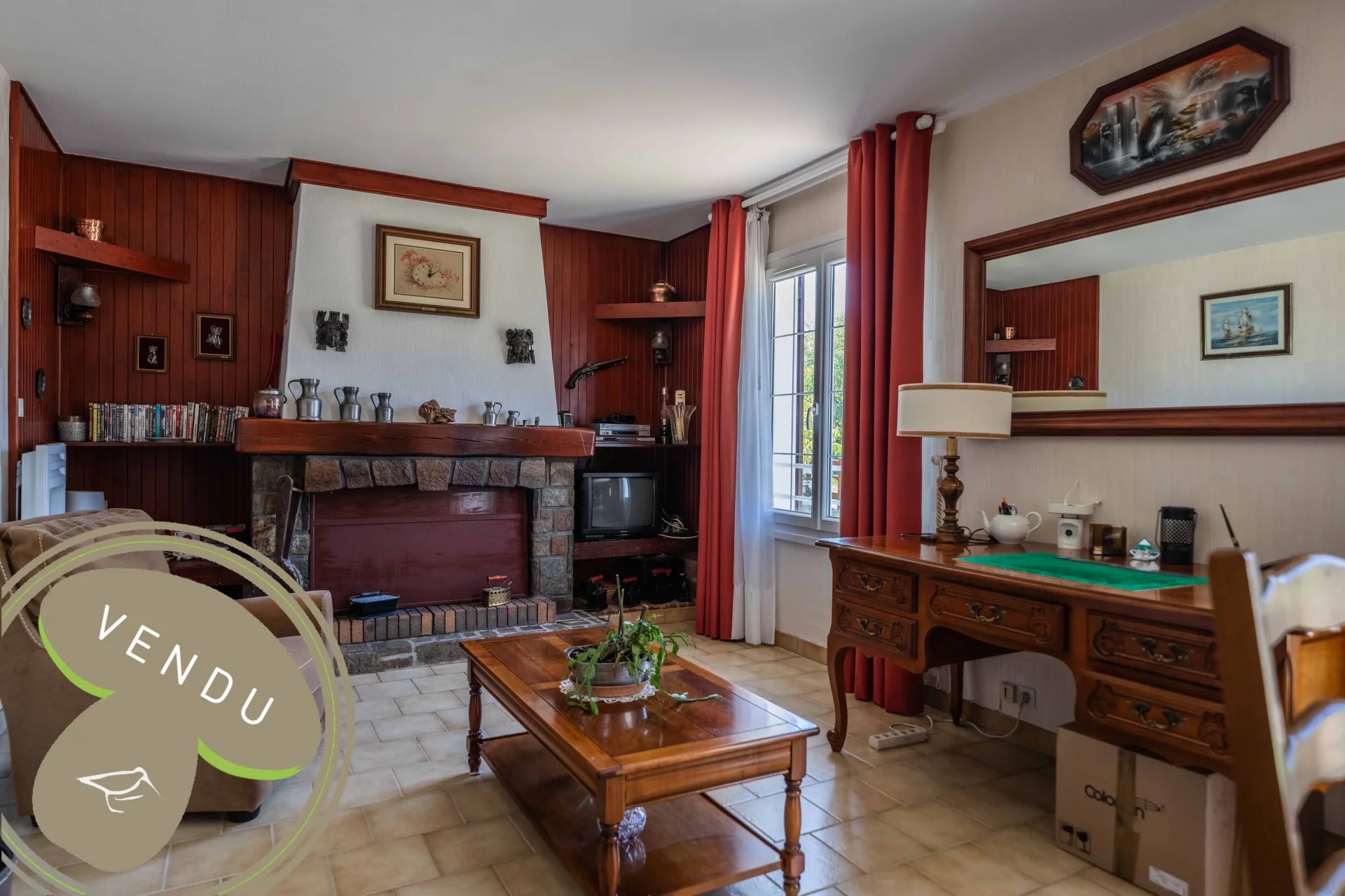 La pièce de vie d'environ 30 m², lumineuse et conviviale, s'agrémente d'une cheminée en pierre à foyer ouvert. La cuisine est indépendante. Un couloir distribue deux chambres, un bureau (ou chambre d'amis), une salle d'eau et un WC séparé.