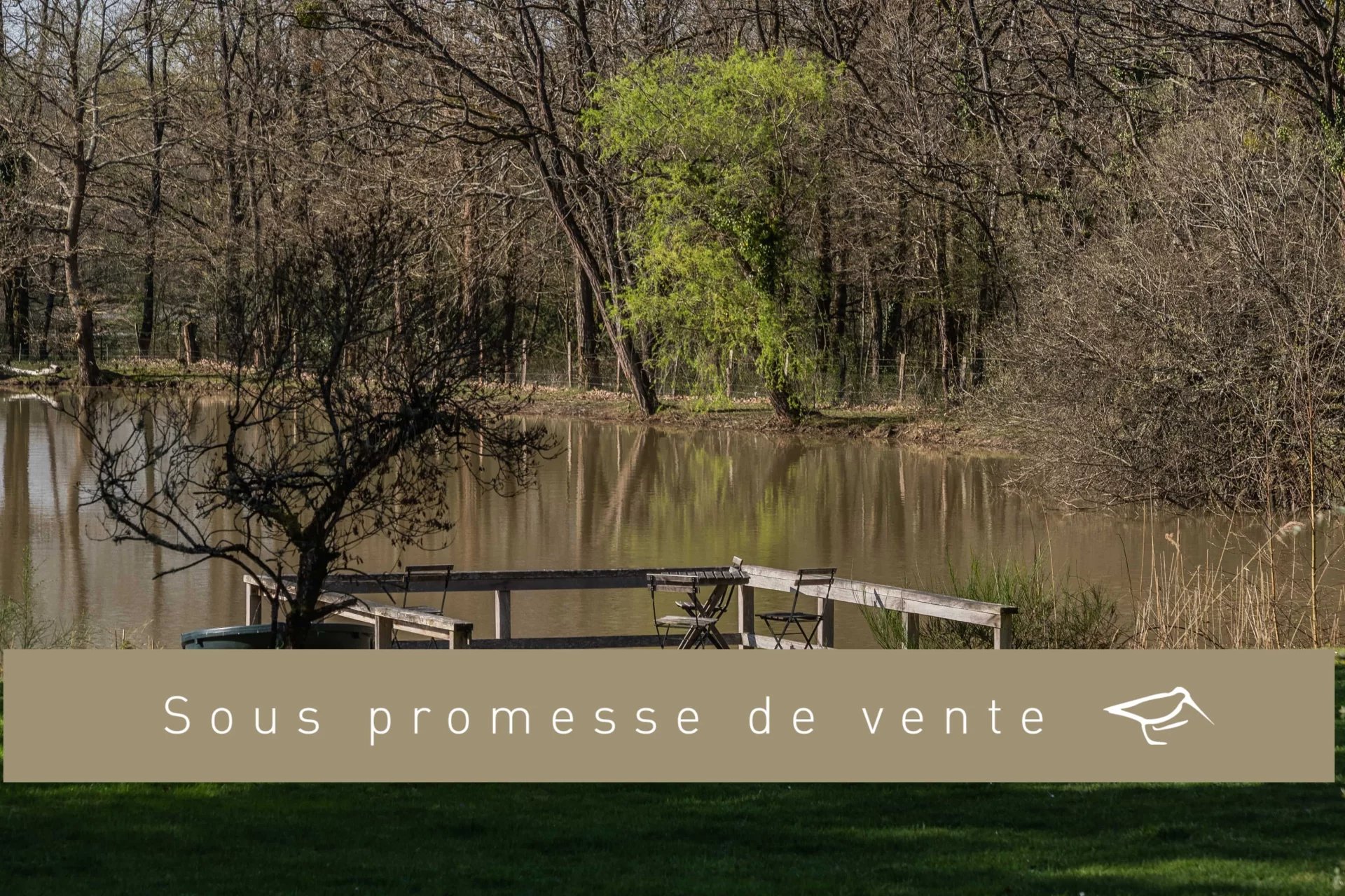Terrasse exposée Sud avec une vue dégagée sur l’étang et son ponton.
